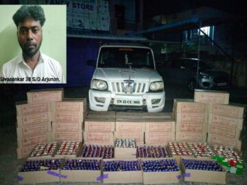 சென்னை – அக் -18,2023 newz – webteam செங்கல்பட்டுமாவட்டத்திற்கு கடத்தி வரப்பட்ட ரூ2,60,000/- லட்சம் மதிப்பிலான 2808 பாண்டிச்சேரி மது பானபாட்டில்கள் பறிமுதல் ஒருவர்கைது.தமிழகத்திற்கு பிற மாநில மதுபானங்கள் கடத்தப்படுவதைக் கட்டுப்படுத்த தமிழ்நாடு...